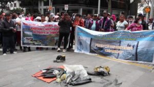 Decenas de pescadores artesanales arrojaron peces negros este martes a las afueras de la empresa española Repsol en Lima, como protesta por la contaminación que causó un derrame de crudo de la petrolera en enero, en las costas de Perú. El grupo de manifestantes elevó enormes pancartas y arrojó peces muertos teñidos de negro para […]