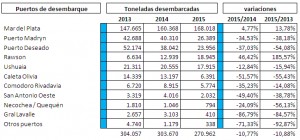 Comparando ese periodo del 2013 con 2015, en Patagonia Caleta Olivia es el gran perdedor de toneladas desembarcadas con un 55,43% menos. Le sigue Puerto Deseado con -54,08%: Puerto Madryn con -38,18%; San Antonio Oeste con -38,78%; Ushuaia con -15,94% y Comodoro Rivadavia con -14,08%. La única excepción en la Patagonia fue Rawson cuyo puerto, entre 2013 y 2015 incrementó sus desembarcos en un 185,57%. Es importante la importancia que en Rawson tiene la captura de Langostino.