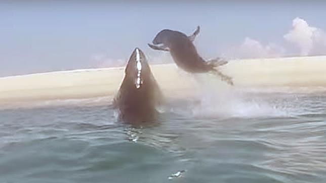 Las impresionantes imágenes fueron captadas por un equipo de investigadores de la División de Pesquerías Marítimas de Massachusetts (Estados Unidos). El escenario son las aguas próximas a la isla de Monomay, un lugar que para los tiburones blancos es una especie de ‘buffet libre’. Según los científicos que contemplaron de cerca esta lucha por la vida, es realmente extraño ver a uno de estos depredadoressaltar fuera del agua para atacar a sus presas. No existen muchos registros en vídeo de comportamientos similares.