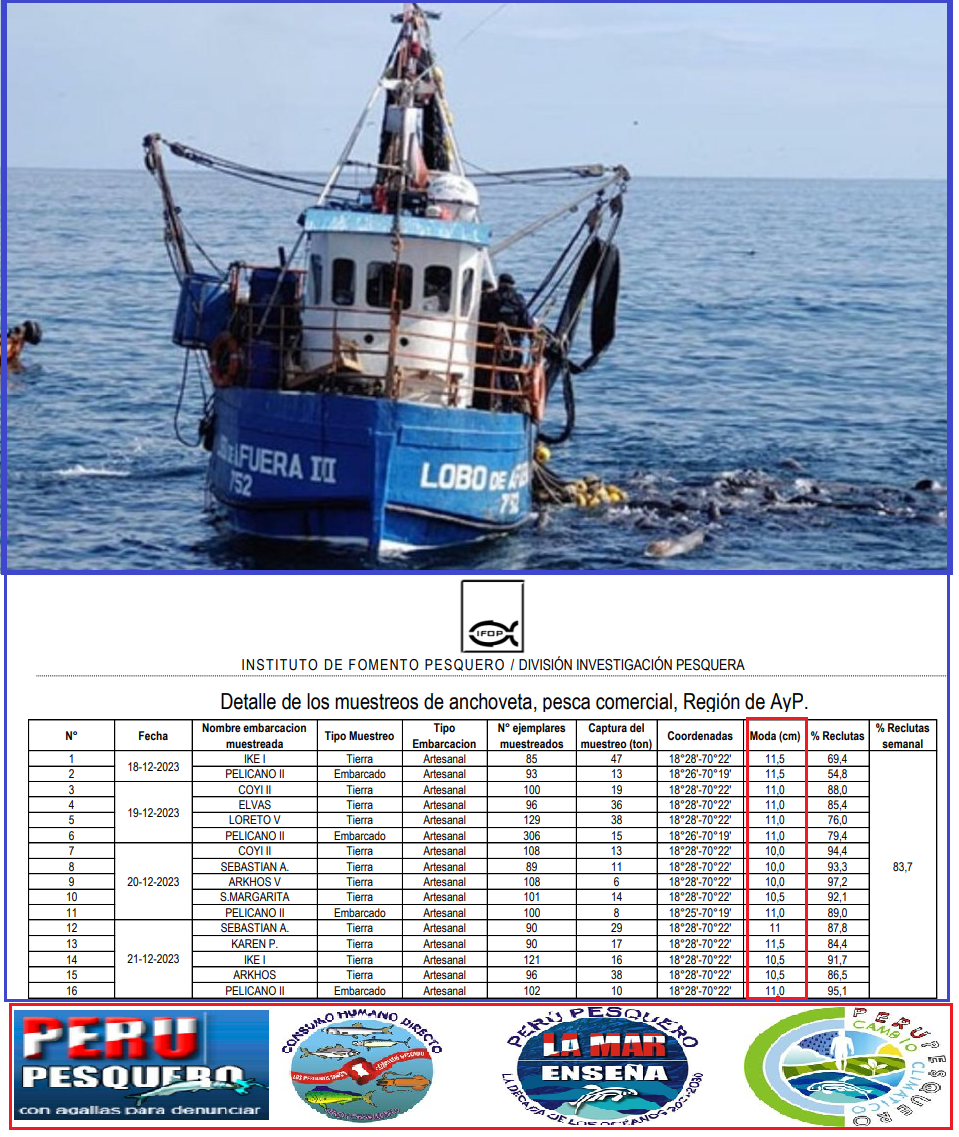 Así tenemos, que conforme los resultados del monitoreo que realizó el IFOP de la semana 51 de 2023, se midieron 1.814 ejemplares de anchoveta, registrando una amplitud de talla desde 7,0 a 13,5 cm de LT, teniendo en cuenta que la flota pesquera artesanal opero sobre el recurso a 3 millas náuticas (mn) del Pto. de Arica (18°28’ LS), siendo que el porcentaje de ejemplares reclutas ponderados en número a la captura estimada fue de 84% (10 a 11.5 cm), reportándose enmalle por parte del Observador Científico (O.C) a bordo.
