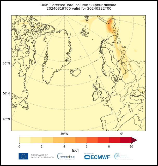 Las previsiones del CAMS sobre la composición atmosférica, basadas en la asimilación de observaciones por satélite, incluyen información sobre la cantidad de SO2 en la atmósfera, del que las erupciones volcánicas pueden ser una fuente importante. Las previsiones realizadas para Islandia tras la erupción muestran penachos con un aumento de la carga total en columna (hasta 10 unidades Dobson), desplazándose hacia el este desde el Atlántico Norte a través de Irlanda y el Reino Unido, alcanzando Escandinavia el miércoles, viajando a través del Báltico y llegando a los Estados Bálticos, Polonia y el noroeste de Rusia el viernes.