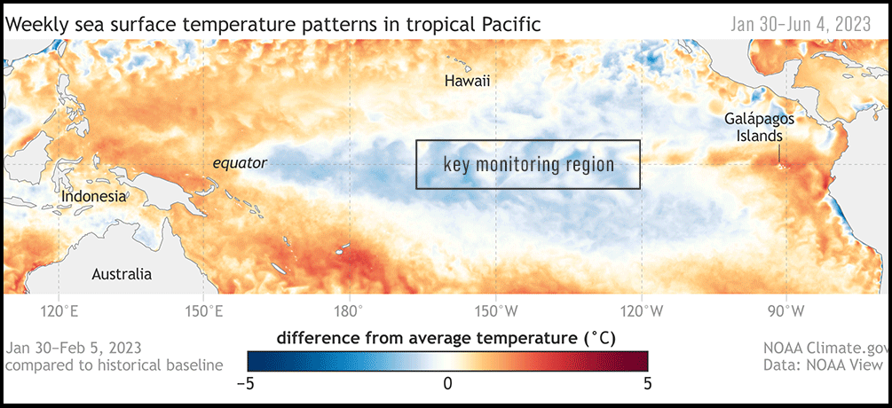 El Niño es un fenómeno climático natural marcado por temperaturas de la superficie del mar más cálidas que el promedio en el Océano Pacífico central y oriental cerca del ecuador. Esto ocurre en promedio cada 2 a 7 años. Los impactos de El Niño en el clima se extienden mucho más allá del Océano Pacífico.