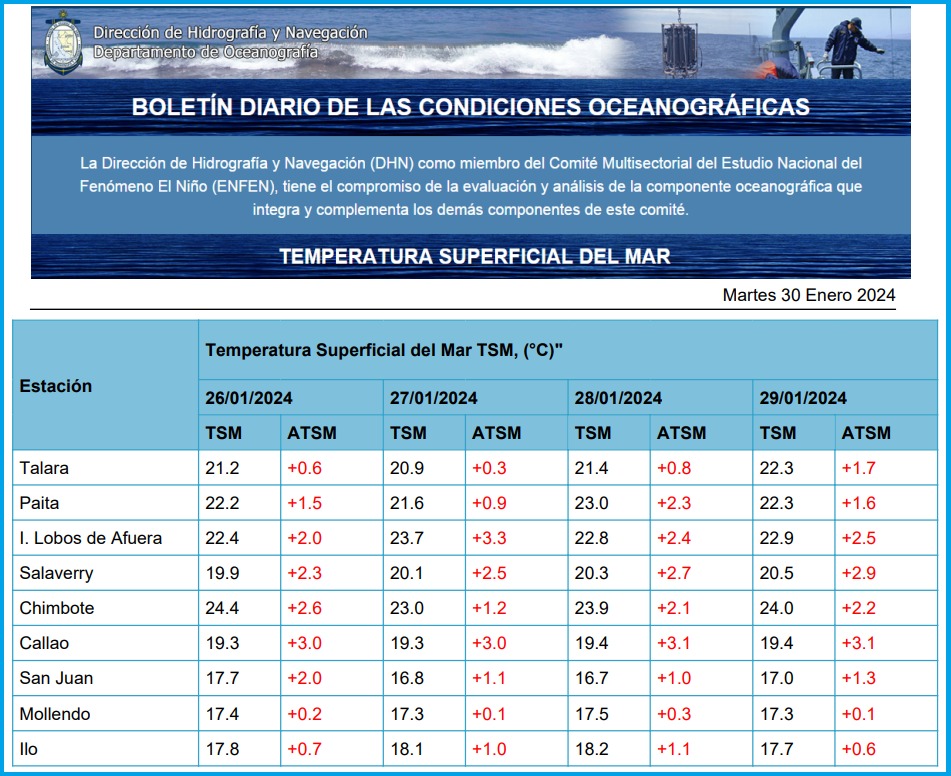 Si bien es cierto, la información que brinda la NOAA nos tranquiliza mucho; sin embargo, otra es la data que ofrece la Dirección de Hidrografía y Navegación del Departamento de Oceanografía de la Marina de Guerra del Perú (boletín 30 de enero, https://www.dhn.mil.pe/portal/boletin-diario-condiciones-oceanograficas), donde se aprecia el aumento de las anomalías de temperaturas de mar, en la zona central de Perú, por ejemplo, el día 29 de enero, Chimbote presentó 24.0°C (TSM), +2.2°C, asimismo, Callao 19.4°C (TSM), +3.1°C.