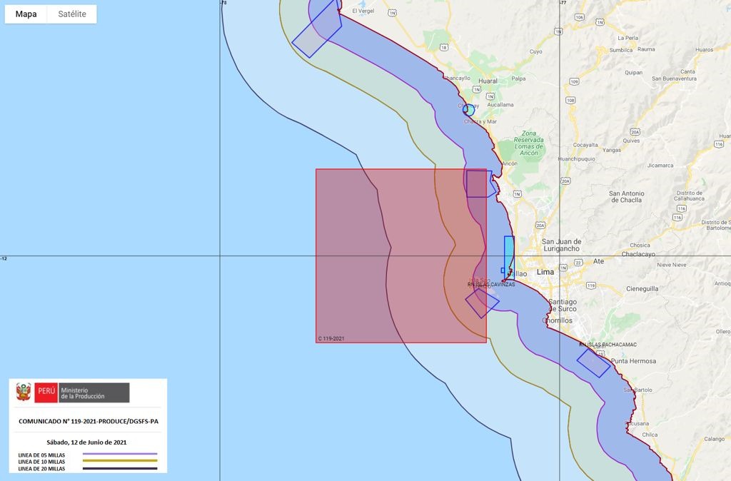 Entre los 11°45’S a 12°15’S y de 77°13’W a 77°43’W del dominio marítimo (frente a Callao – Callao)