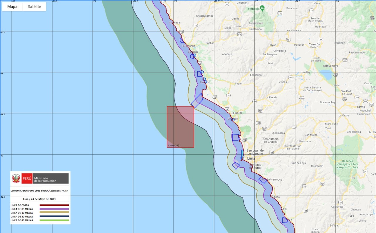 Entre los 11°25’S a 11°55’S y de 77°45’W a 78°05’W del dominio marítimo (frente a Chancay – Lima)