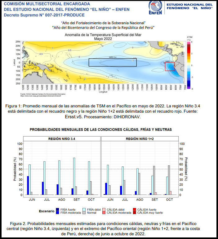 La Comisión Multisectorial del ENFEN mantiene el estado “Alerta de La Niña costera”, debido a que se espera que la temperatura superficial del mar en la región Niño 1+2 continúe con valores por debajo de lo normal hasta agosto de 2022; siendo más probable la magnitud fría débil.