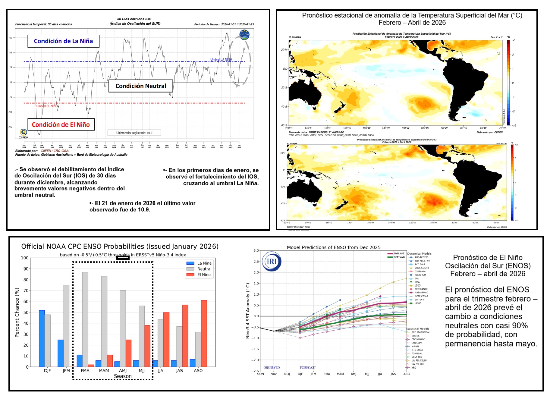 El Centro Internacional para la Investigación del Fenómeno de El Niño (CIIFEN) publicó su boletín científico de enero de 2026, en el que pone el dedo en la llaga frente a los pronósticos que anuncian un supuesto “Niño costero” en Perú. Respaldado por modelos climáticos internacionales, el organismo señala que entre febrero y abril de este año existe cerca de un 90% de probabilidad de que el Pacífico ecuatorial se mantenga en condiciones neutrales, sin presencia de El Niño ni de La Niña, descartando así los escenarios que anticipan este fenómeno entre abril y octubre.