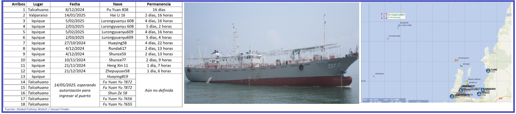 Entre ellas se encuentra la nave Fu Yuan Yu 7872 (IMO: 9874064), que según Bait to Plate, fue sancionada por el Departamento del Tesoro de los Estados Unidos debido a su implicación en el transbordo ilegal de miles de tiburones en 2017 y por denuncias de trabajo forzado y violencia a bordo.