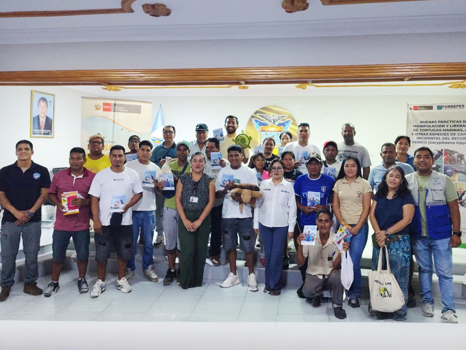 Con el objetivo de fomentar la pesca sostenible y la conservación del ecosistema marino, el Ministerio de la Producción (Produce), a través del Fondo Nacional de Desarrollo Pesquero (FONDEPES), capacitó a 51 agentes de la pesca artesanal del distrito de San Andrés y San Juan de Marcona, en la región Ica, mediante el curso de “Buenas prácticas de liberación de tortugas marinas, aves y otras especies en captura incidental”.