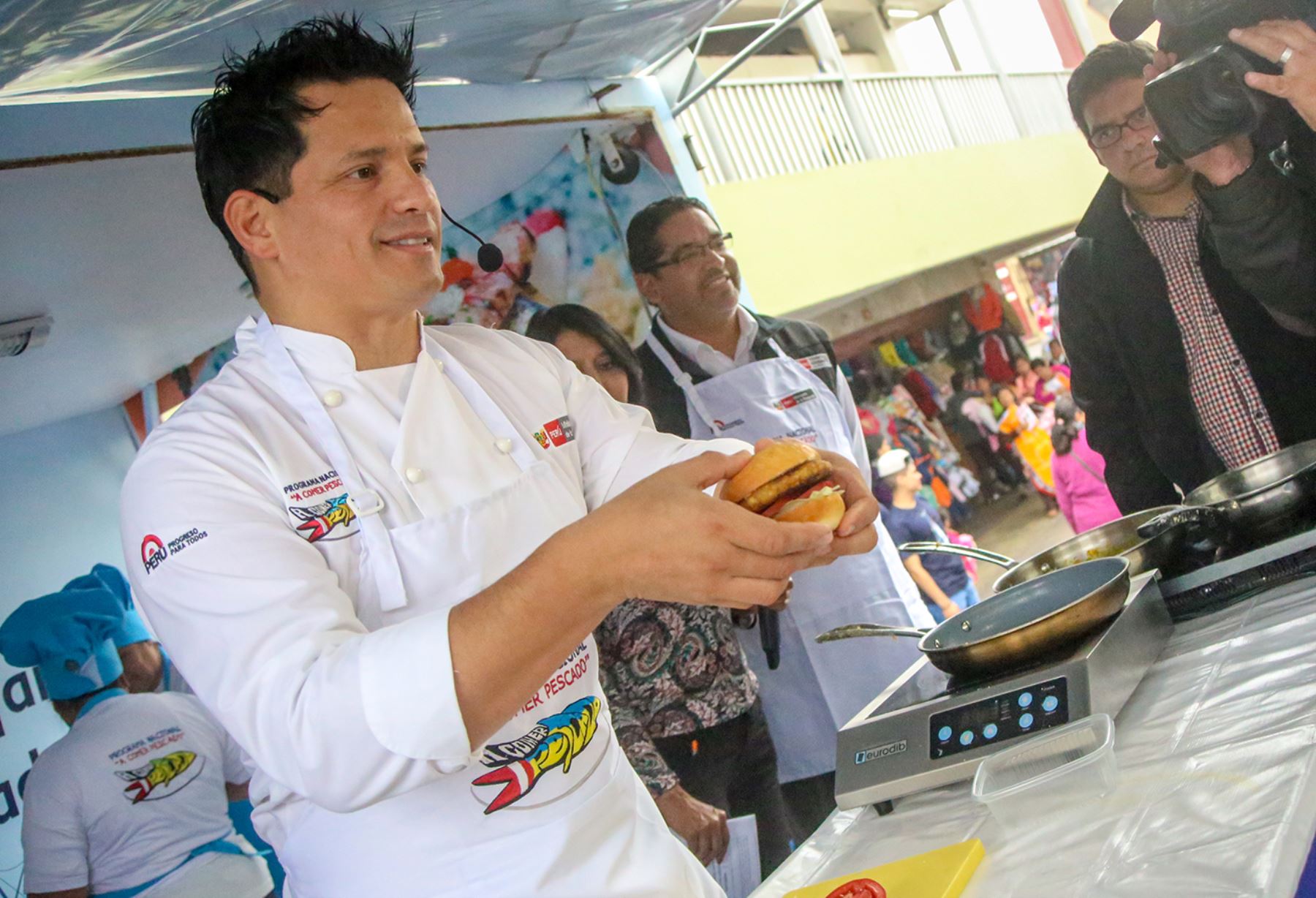 La primera edición de ‘La Caravana Pesquera’ tuvo lugar en el Mercado Central de Lima y contó con la presencia del chef nacional Flavio Solórzano, quien enseñó al público a preparar: hamburguesa de Pota a la parrilla y Bonito en salsa de tomate. En estas demostraciones también participaron madres de comedores populares y emprendedores exitosos.