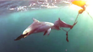 BARCELONA – Una hembra de Delfín trata de salvar a su cría de una trampa para tiburones
